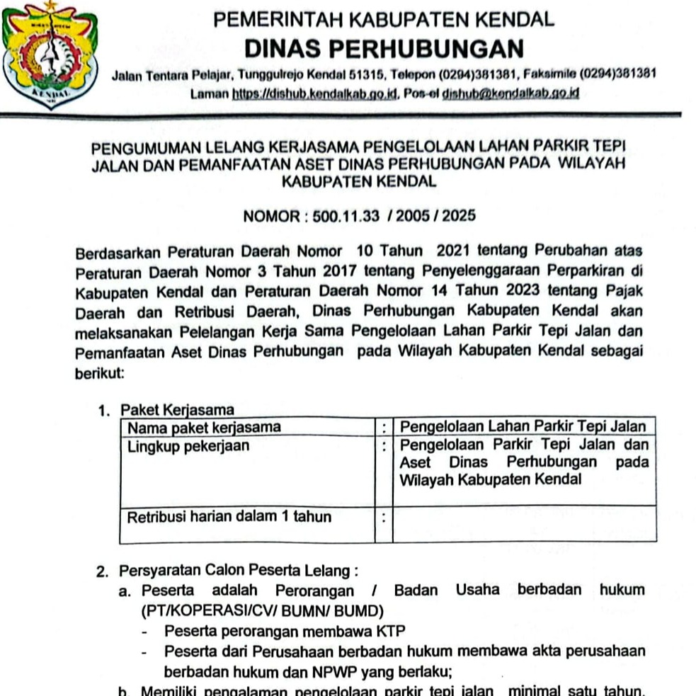 Read More BeritaPengumuman PENGUMUMAN KERJASAMA LELANG PENGELOLAAN LAHAN PARKIR TEPI JALAN DAN... PENGUMUMAN KERJASAMA LELANG PENGELOLAAN LAHAN PARKIR TEPI JALAN DAN PEMANFAATAN ASET DINAS...