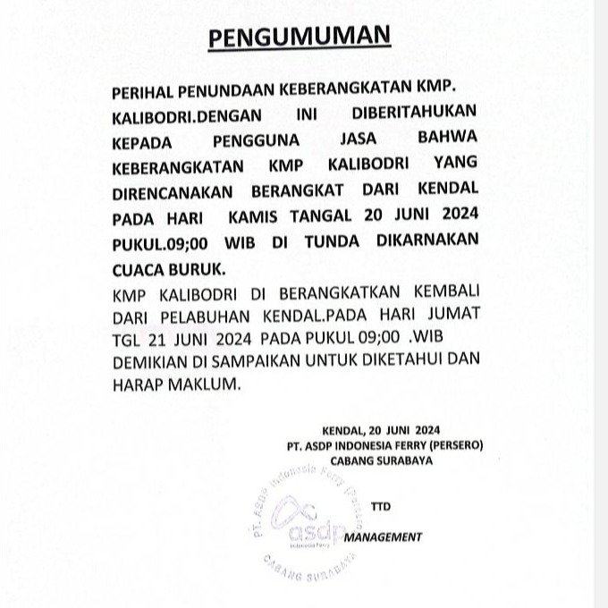 Read More Pengumuman Penundaan Keberangkatan KMP. Kalibodri yang direncanakan berangkat dari... Penundaan Keberangkatan KMP. Kalibodri yang direncanakan berangkat dari Kendal pada hari Kamis...