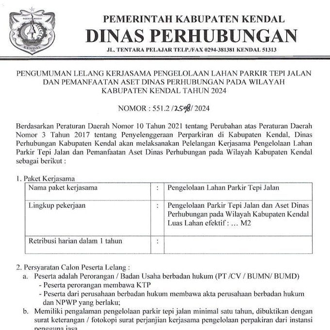 Read More Pengumuman PENGUMUMAN LELANG KERJASAMA PENGELOLAAN PARKIR TEPI JALAN DAN PEMANFAATAN... PENGUMUMAN LELANG KERJASAMA PENGELOLAAN PARKIR TEPI JALAN DAN PEMANFAATAN ASET DINAS PERHUBUNGAN...